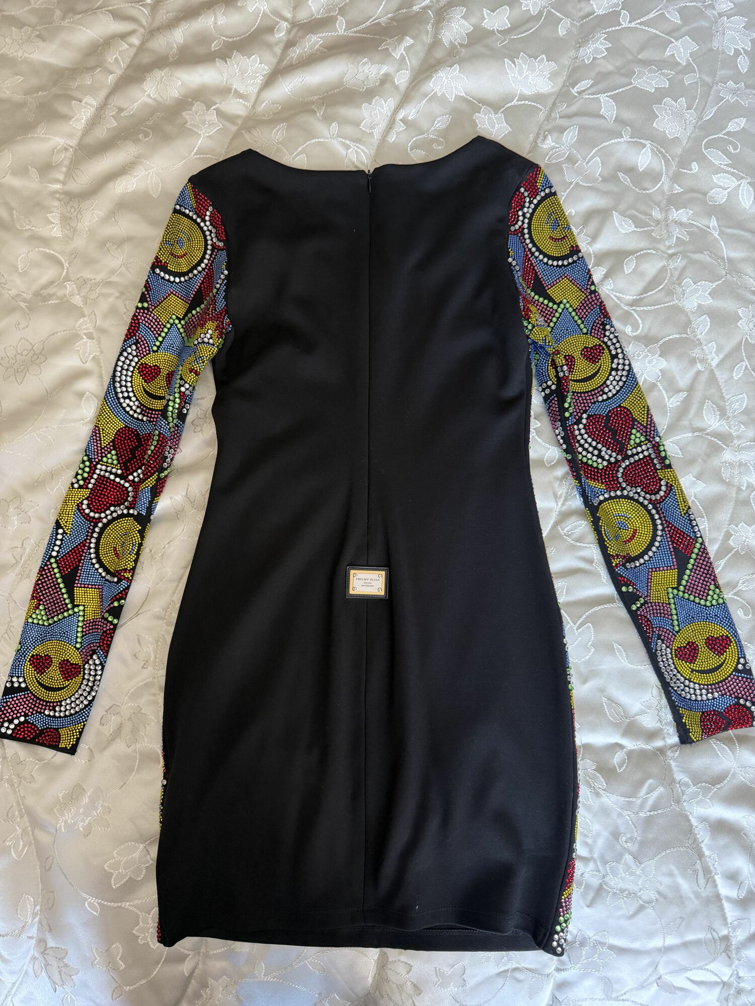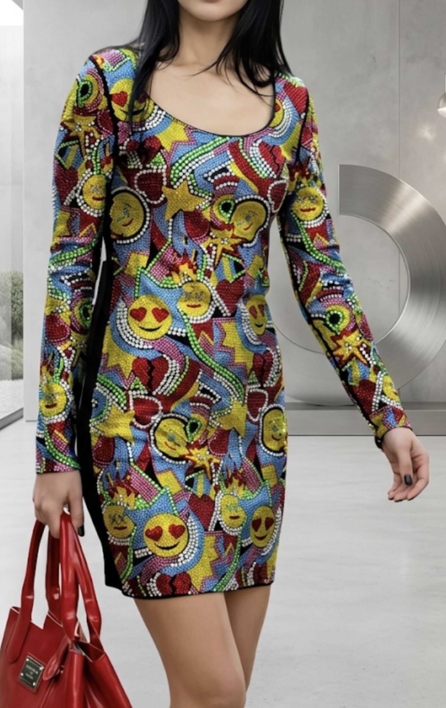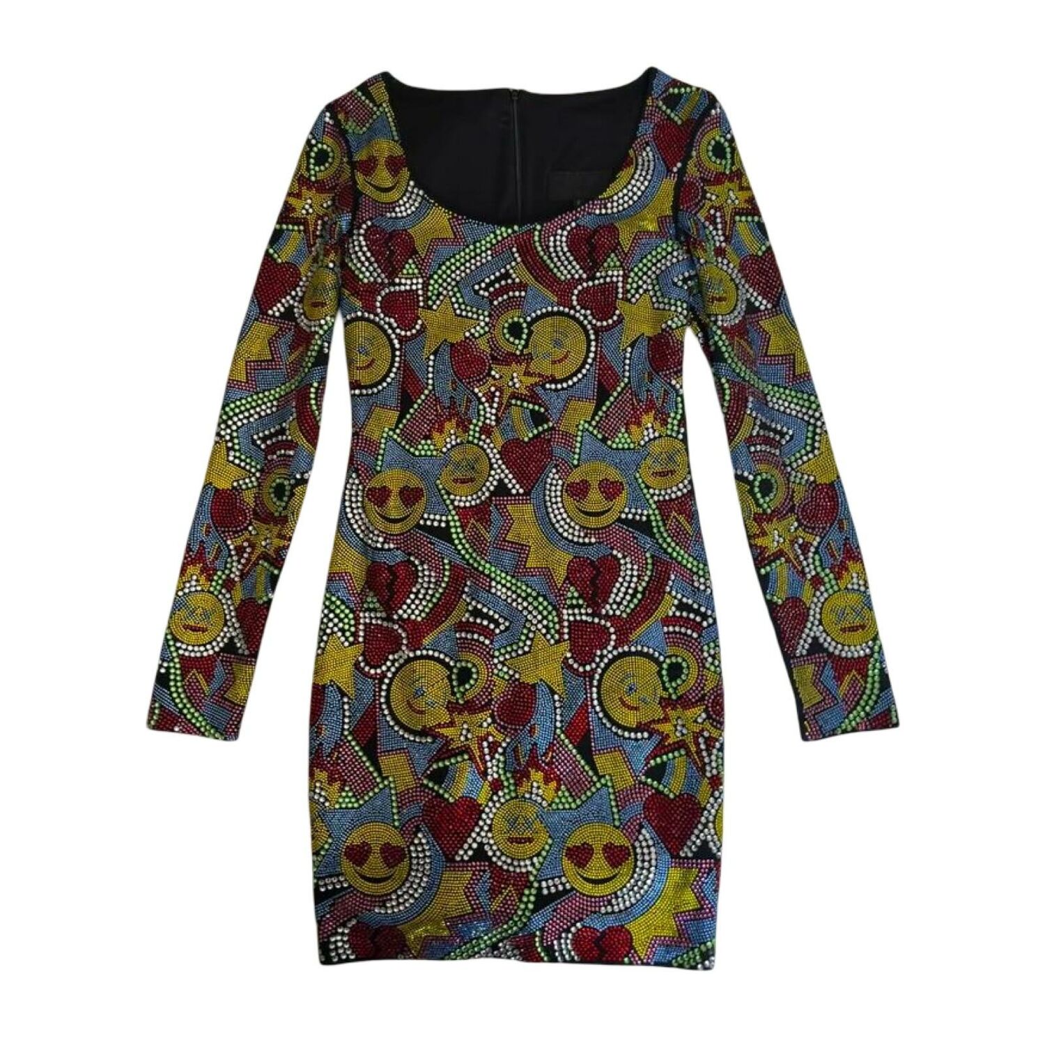 Design: Long-sleeve, bodycon silhouette featuring an all-over, hand-finished multi-colored crystal pattern (Pop-art Emojis, Hearts, and Stars).